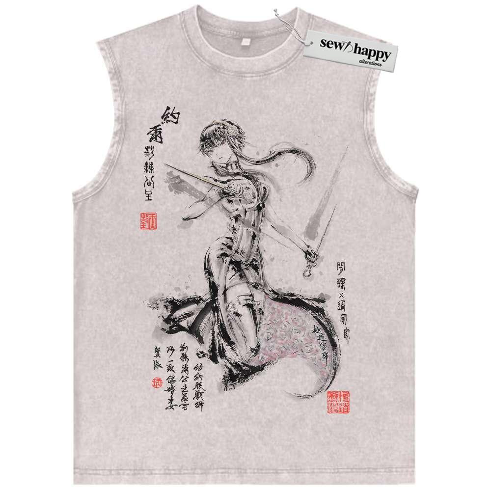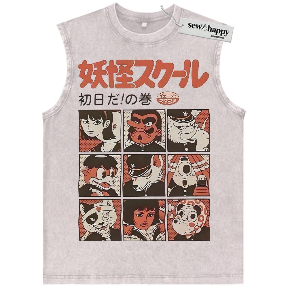 Wash Tank Top Yokai School Tank Top, Japanese Streetwear Tank Top, Vintage Tank Top